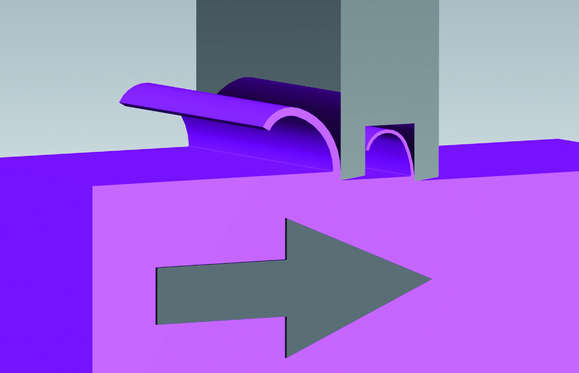 Принцип LEUCO TwinBlade: Першим кроком є зняття основного шару матеріалу, усунення нерівностей, які виникли після фрезерування. Другий крок складається зі зняття тонкого верхнього шару для досягнення високоглянцевої фінішної якості без білої смуги.